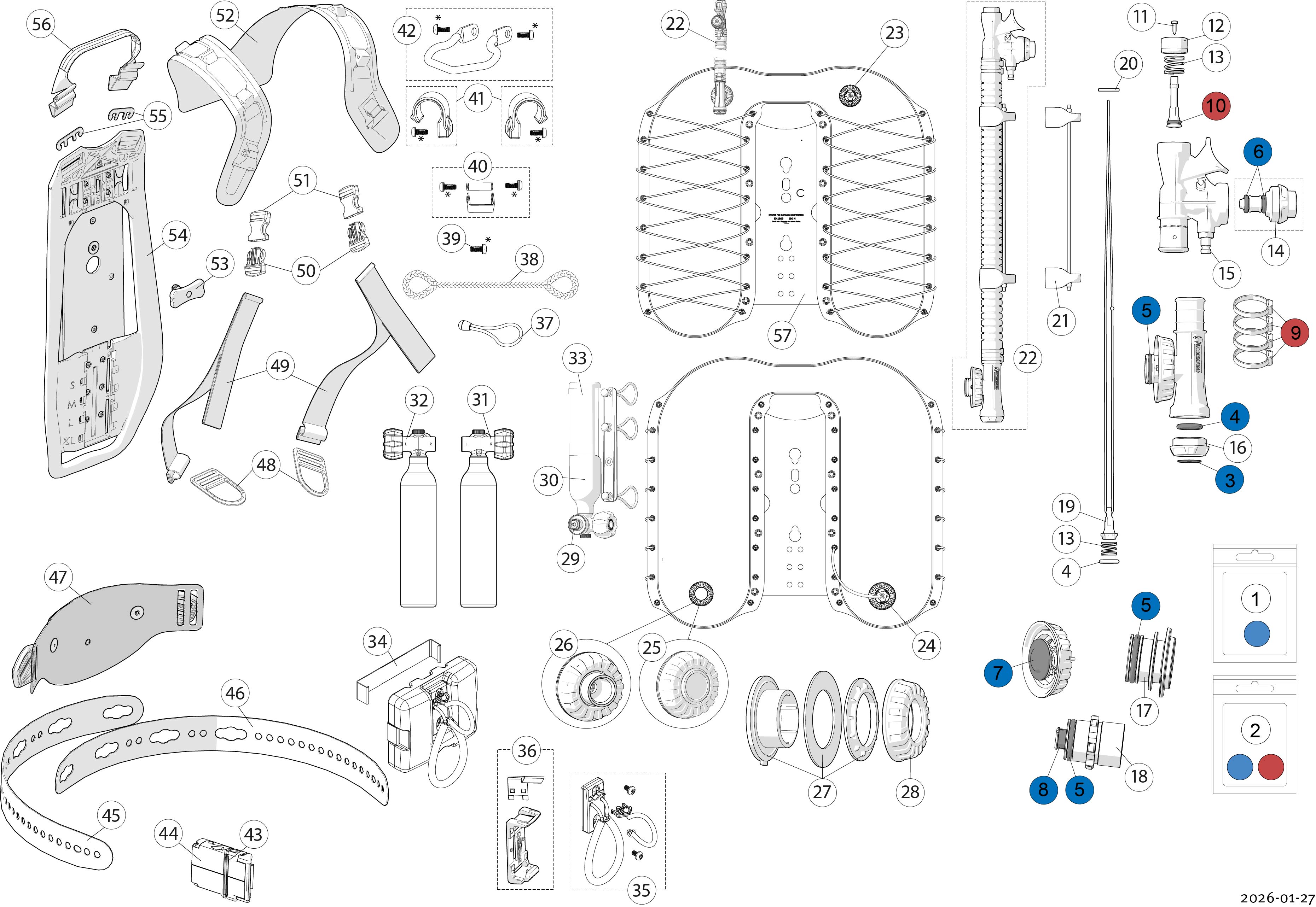 The air supply consists of a new cylinder pack with full composite cylinders with a newly developed quick release to the harness / BC, you can read more about the pack here.
