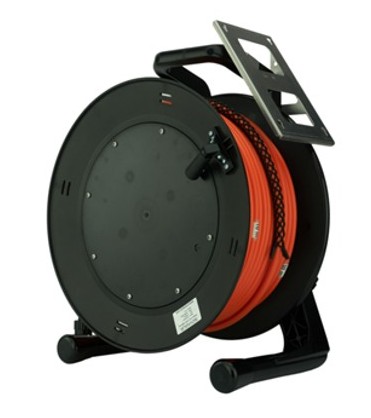 The cable reel is made from plastic and rubber. The reel is fitted on the back with a multipin bulkhead connector for quick connection of a patch cable to the surface control box.