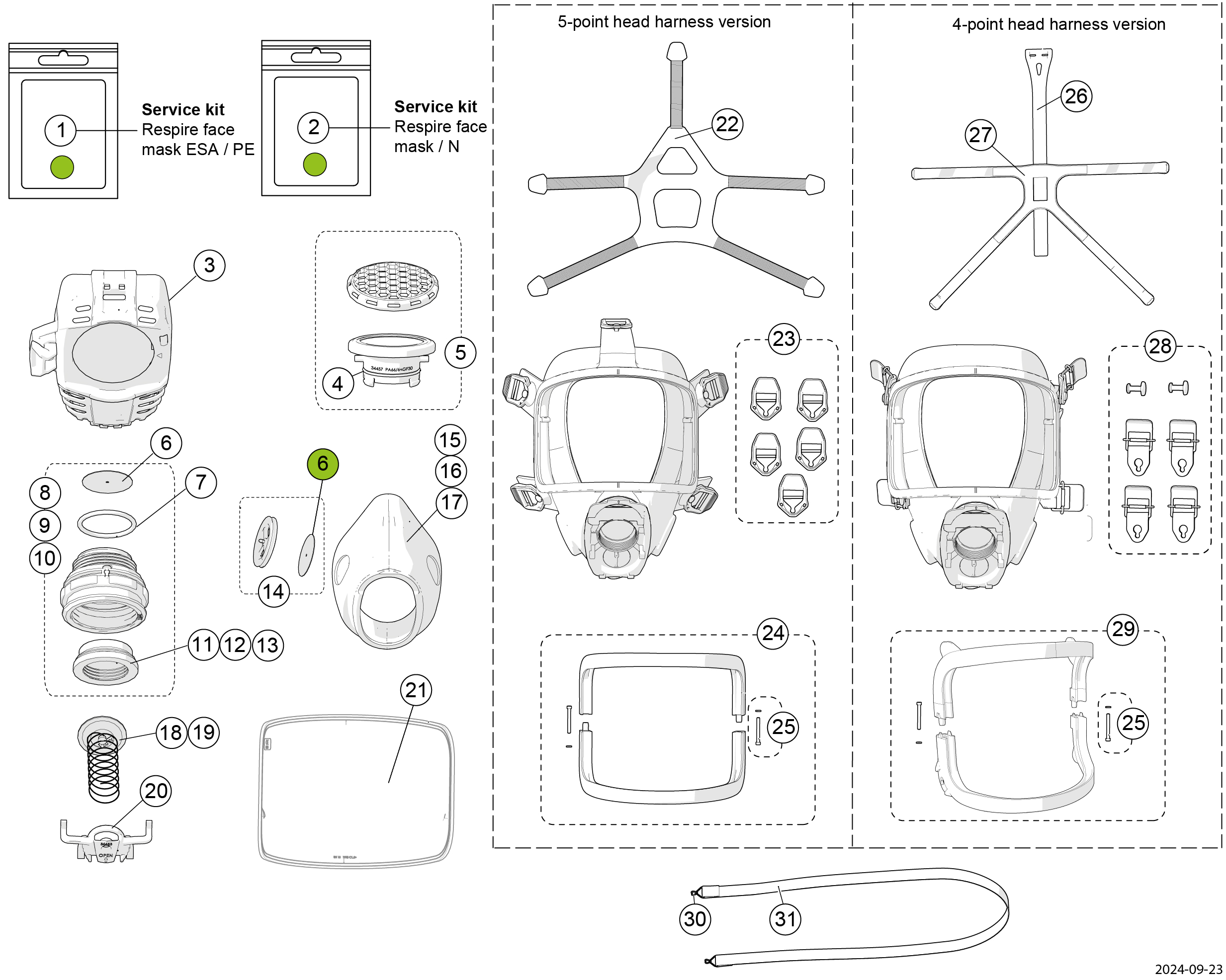 The standard version is made from EPDM and has a 5-point head harness. This version is available in the three different sizes Standard size, Small size (S) and X-large size (XL).