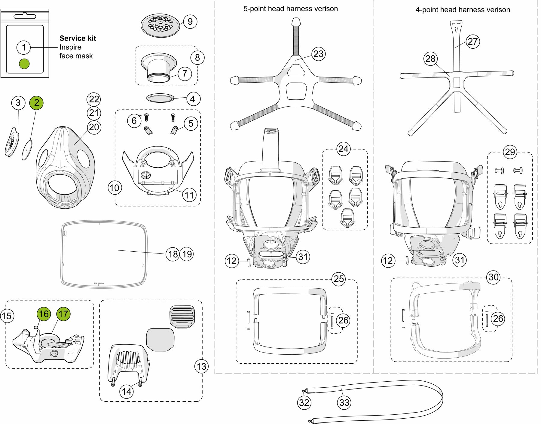 There is a variant compatible with helmet adapters with a 4-point head harness and a top strap. This variant is available in Standard size only. When ordering this mask version it is delivered including head harness, buckles and neck strap. But if it is ordered together with "Pre-delivery mounting of helmet adapter" (see Accessories below) it is delivered without head harness, buckles and neck strap.