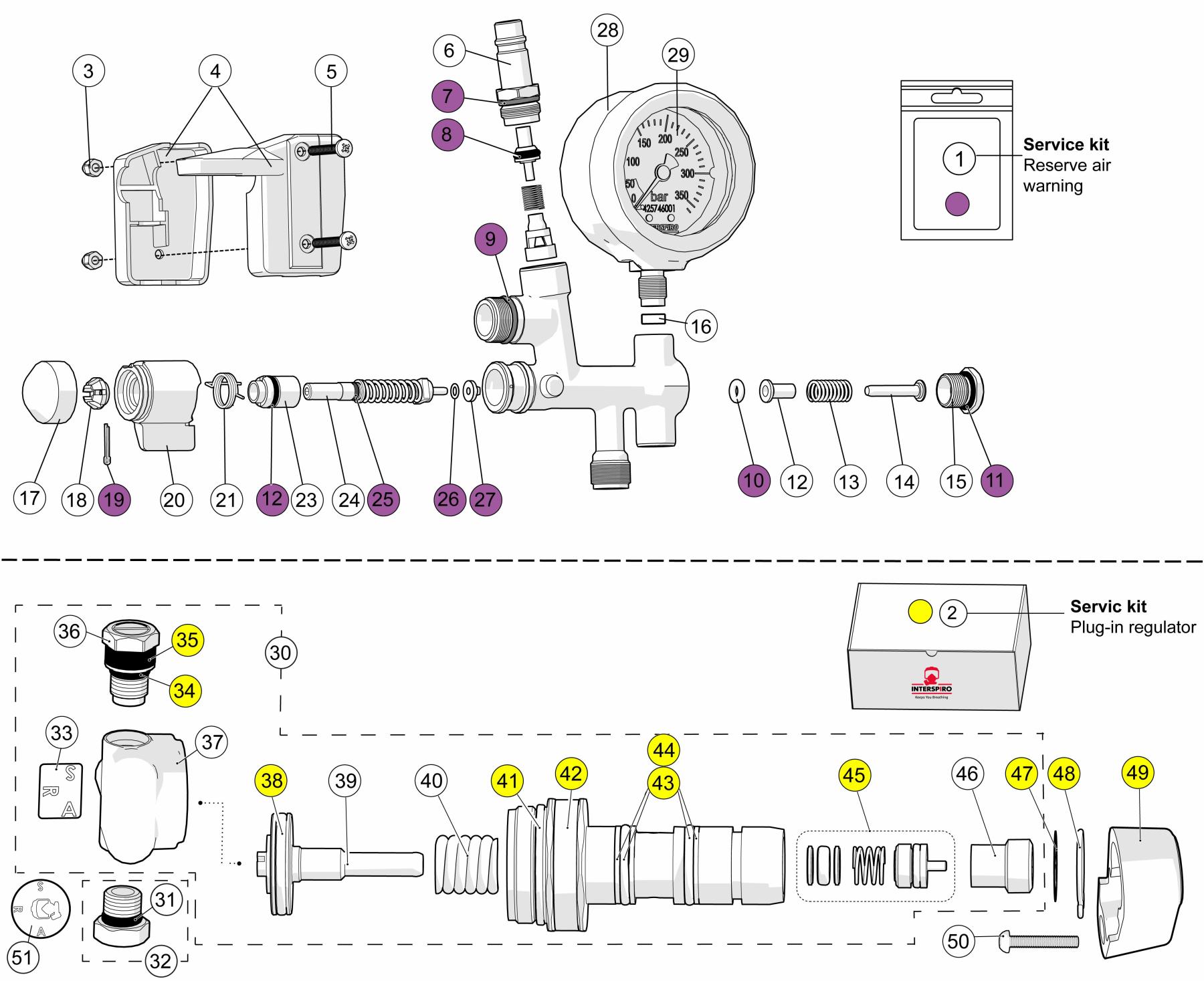 The plug-in type regulator is durable and has proven functionality with high flow capacity maintaining the safety pressure also at an extreme rate of breathing and low cylinder pressures. The plug-in type design makes service and repairs easy to perform with short down time.