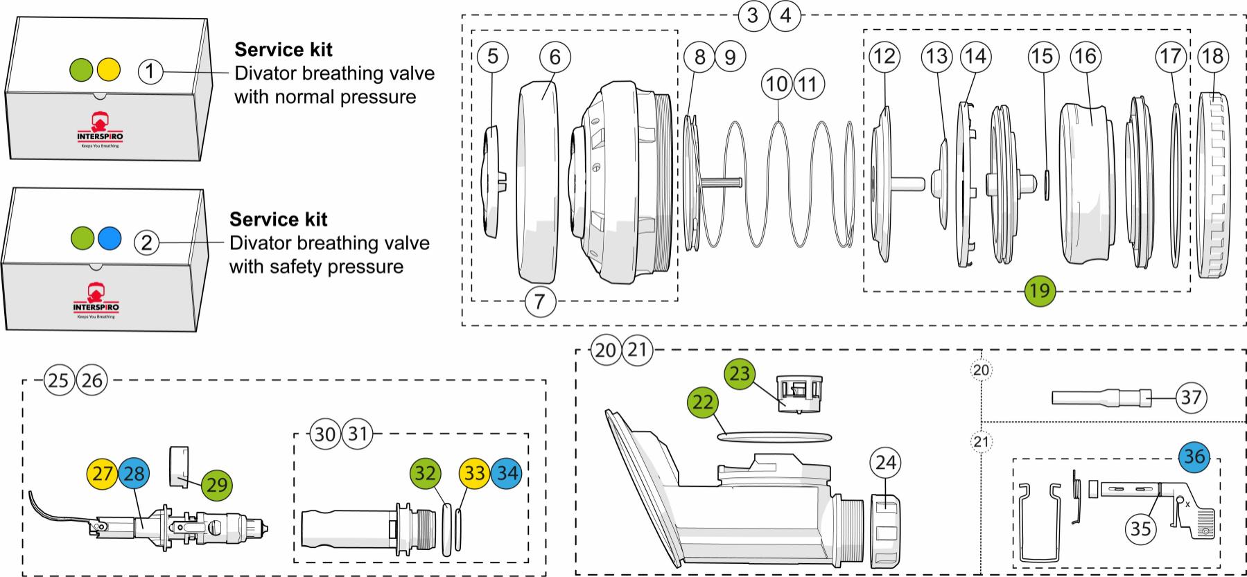 The Divator breathing valve is available with safety pressure or with normal pressure. The safety pressure is turned on automatically when the user takes his first breath in the mask. The safety pressure reduces the risk of inward leakage of water (or air at surface) and is very important when diving in contaminated water. The safety pressure in the mask is maintained regardless of the diver's air consumption rate.