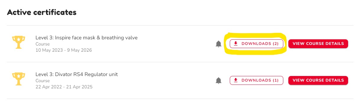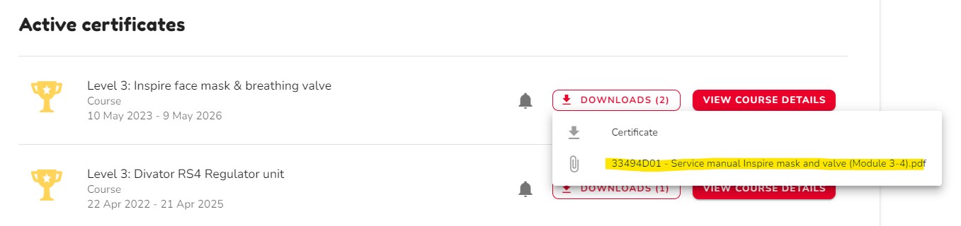 The list that opens shows your course certificate and associated service documentation. The example below shows downloads for the course "Inspire Mask and Valve".